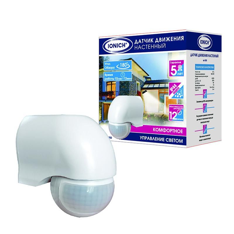 Читать все статьиДатчик движения настенный 12м 1200Вт 12мин бел. IONICH 2002