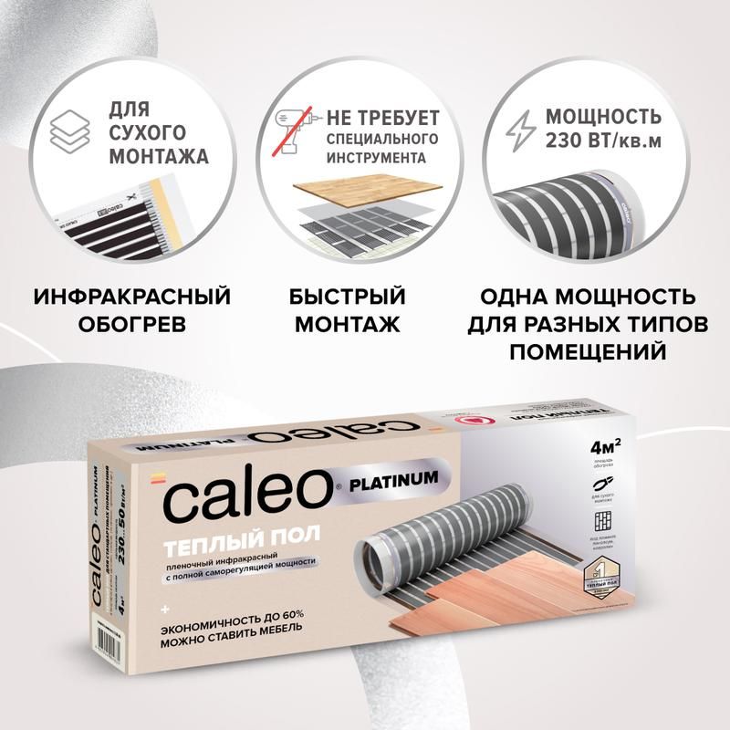 Особенности Caleo Platinum · Предотвращает "запирание" мебелью за счет саморегуляции, пол не будет нагреваться под крупными предметами. · Монтаж без стяжки и клея, который можно включать сразу после установки. · Гарантия в течении всего срока службы пола – 50 лет. Характеристики теплого пола Caleo Platinum · Уникальный высокотехнологичный пленочный теплый пол. · Мощность от 50 до 230 Вт. · Подходит для стандартных и холодных помещений. · Ширина пленки — 0,5 м. 230...50 Вт/кв.м. · Модифицированная антиискровая сетка проходит по всей ширине пленки, благодаря чему снижен шаг линии отреза. · Расположенная вдоль пленки антиискровая сетка исключает контакт «горячего» с «холодным», разделяя медную шину и нагревательные элементы. Состав комплектов теплого пола Caleo Platinum · Термопленка в рулоне. · Монтажные комплекты (контактные зажимы и битумная изоляция на каждый кв.м). · ПВХ изоляция. · Комплект соединительных проводов. · Инструкция по монтажу, включающая гарантийный талон.