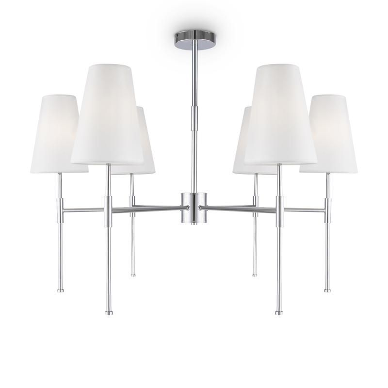 Материал арматуры – металл. Оттенки: хром, комбинация черного и латуни. Абажуры – белая ткань. Акцентный вытянутый силуэт. Источник света – лампа с цоколем E14.